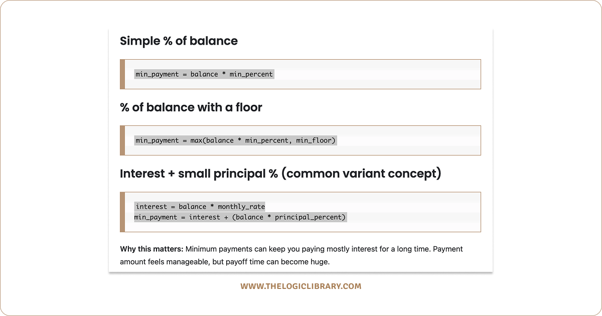 - Payment is typically a small % of balance (or a floor amount)